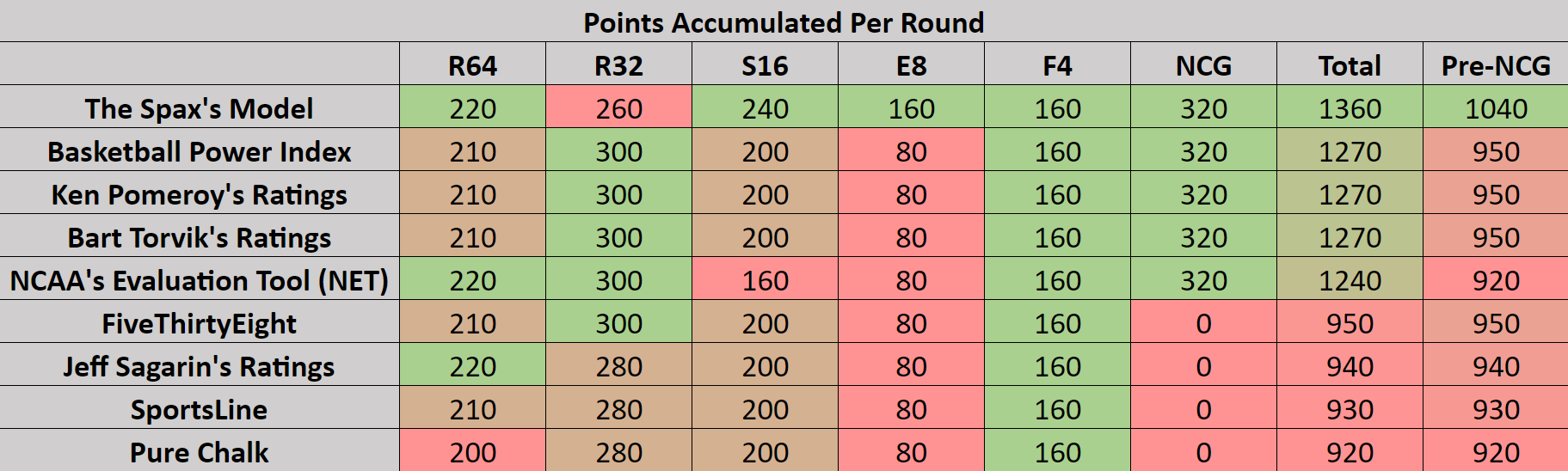Other than a slip-up in the Round of 32, our model rose above the rest of the competition. Because of the enormous number of points rewarded to brackets which correctly predict the National Championship winner, I calculated the points accumulated before the national championship game as well as the real total. In the last column, you can see that other than our own model, every model performed at around the same level going into the final game. The final result just increased the gap.