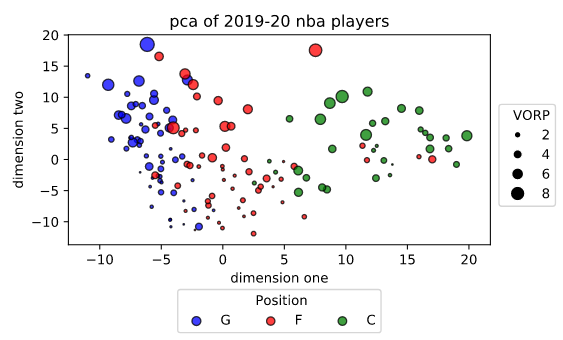 The dimensions are mostly meaningless to us at the moment because we have no idea exactly what they represent. All we know is that they’re made up of our initial 189 features. Looking at this graph, though, we can probably throw out some guesses on what they might represent. The value in dimension one seems to increase as size (assuming centers are bigger than forwards who are bigger than guards) increases, so it’s probably related to rebounding or defense (or both).