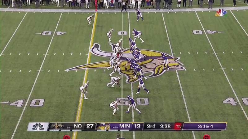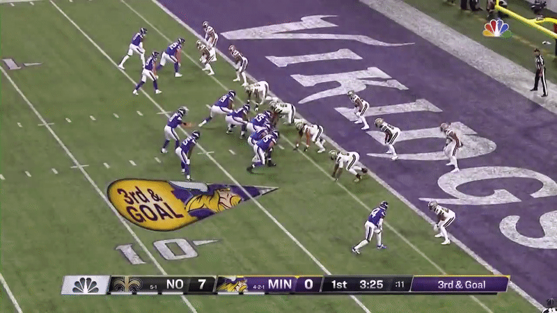 The Vikings are planning a pick play on the left side to get Kyle Rudolph open in the middle. The leftmost receiver (Laquon Treadwell) tries to block Vonn Bell (#24) from reaching Rudolph, but Bell is able to stick to him and force the incompletion. It’s a perfectly defended play by the Saints, forcing a 4th and goal situation.