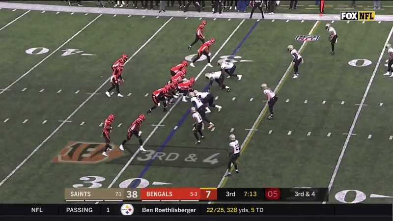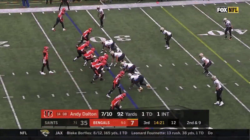 This is what we call a “coverage sack.” It’s when the pass coverage on a play is so good that a QB holds the ball for a long time and is eventually brought down as a result. The Saints only had 3 pass rushers on this play and Dalton had plenty of time to throw, but they still recorded the sack. This is how you know that a secondary is playing extremely well.