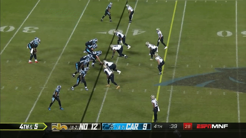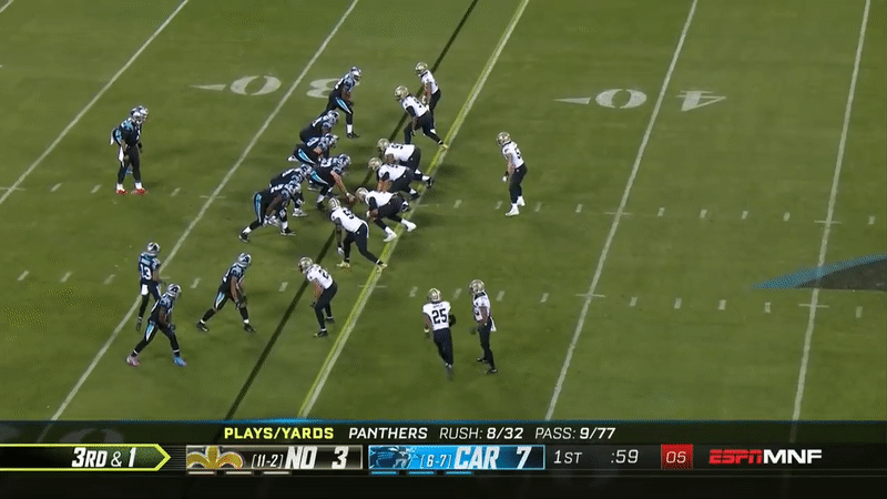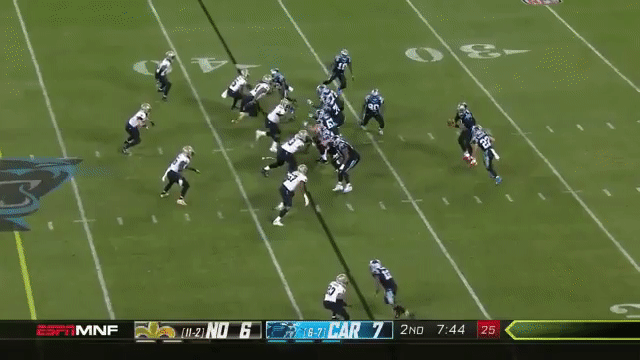 Vonn Bell had a great game against the Panthers. He recorded a sack and a game-changing forced fumble. On this play, he added a pass defense to his stat line. On a 3rd and 1 situation, a completion on the crossing route would mean that the defense stays on the field. Bell forces the incompletion and the Panthers proceed to punt it back to the Saints.