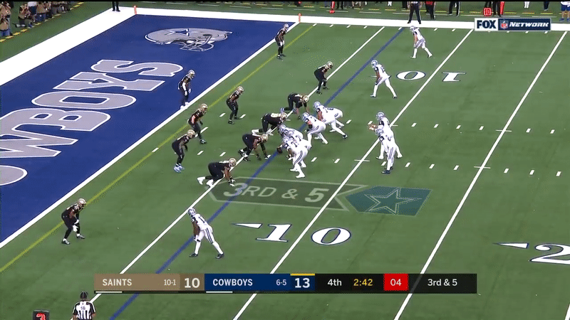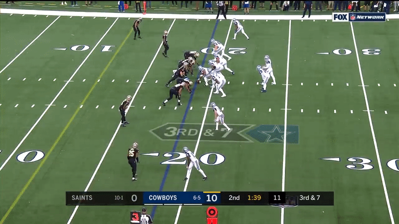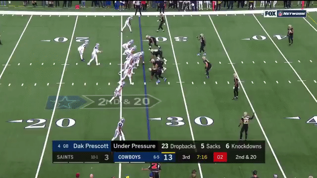 The Cowboys run an outside run, but Sheldon Rankins is able to outrun Ezekiel Elliott and bring him down for a loss of yards. That’s a 300-pound defensive tackle outrunning a First-team All-Pro running back. This is supposed to be something that happens in Madden that makes you smash your controller. “Why is a defensive tackle chasing down my 99 overall running back in the open field?!” Because he’s an athletic freak. Rankins run-stop percentage of 19.2% is the 2nd highest in the NFL, no doubt contributing to the team’s improvement in defending against the run.