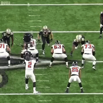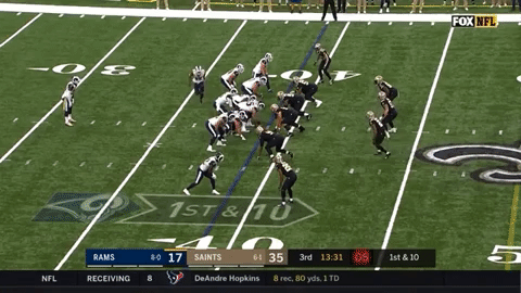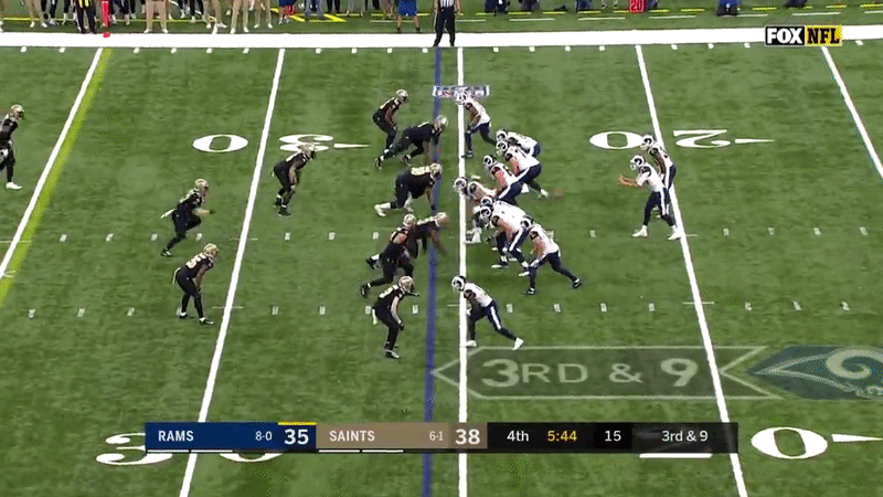 On this play, the Saints’ defense doesn’t fall for the fake jet-sweep to the opposite side of the field. Demario Davis immediately recognizes the play and shoots past the center to tackle Gurley for a loss of 1 yard.